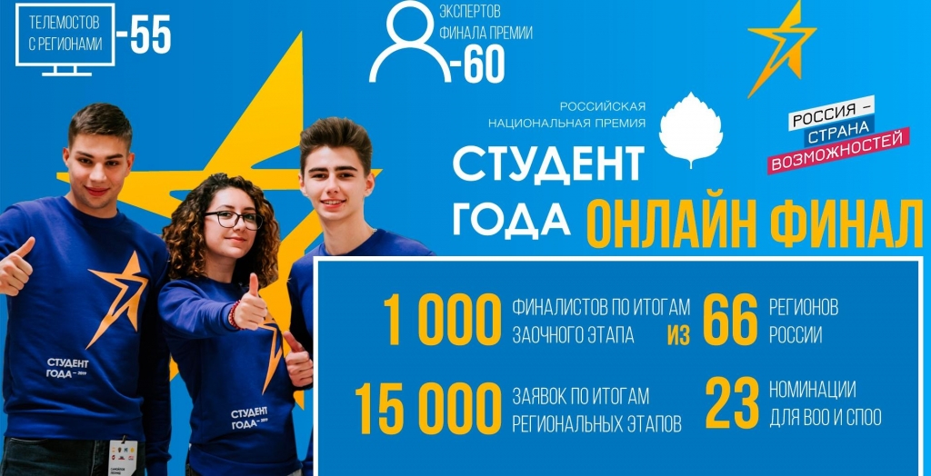 По итогам заочного этапа конкурса Российской национальной премии «Студент года – 2020» в финал прошли 1000 студентов из 66 регионов. В их числе — 11 студентов образовательных организаций Ивановской области и три студенческих объединения, организованных на базе вуза и колледжей.
