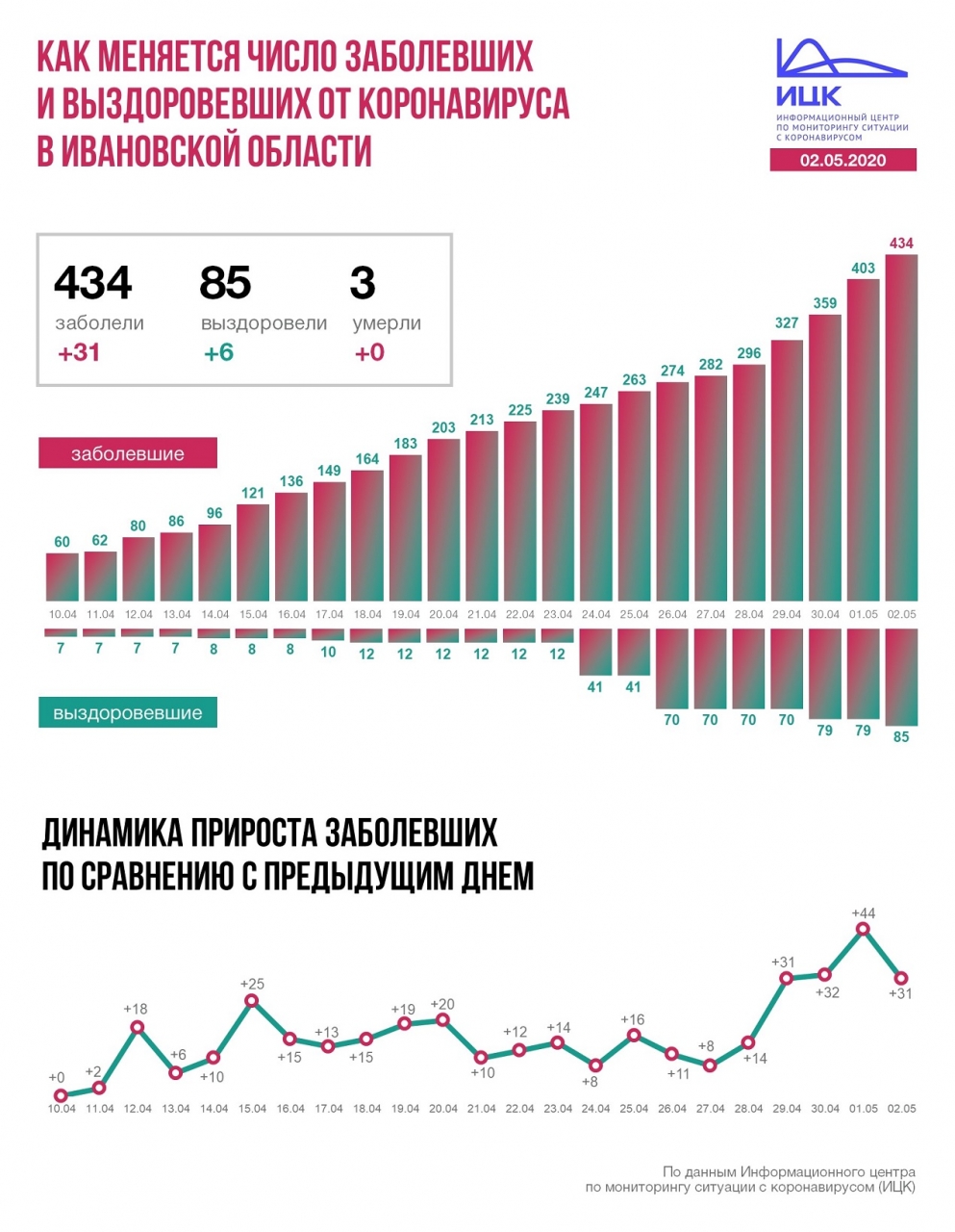 По состоянию на 2 мая 2020 года на территории Ивановской области официально зарегистрированы 434 случая заболевания новой коронавирусной инфекцией (за сутки поставлен 31 диагноз).