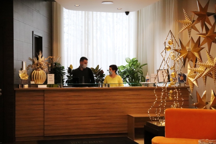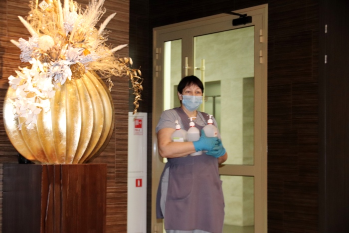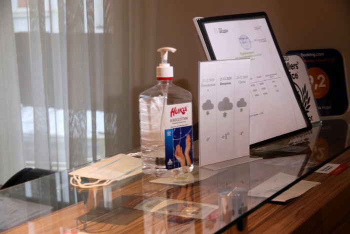 На стойке регистрации установлены защитные экраны, санитайзеры, перчатки и маски для постояльцев, бесконтактные градусники для измерения температуры, как для клиентов, так и для работников – предусмотрено все, чтобы не допустить распространения инфекции. По словам дирекции отелей, на сегодня эта задача в приоритете.