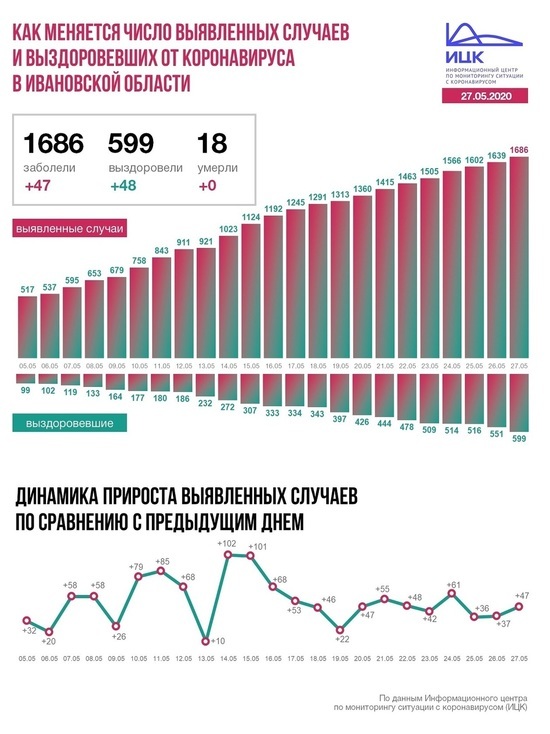 В Ивановской области +47, всего 1686. За последние сутки 48 новых выздоровевших, летальных случаев нет. Всего 599 и 18 соответственно.