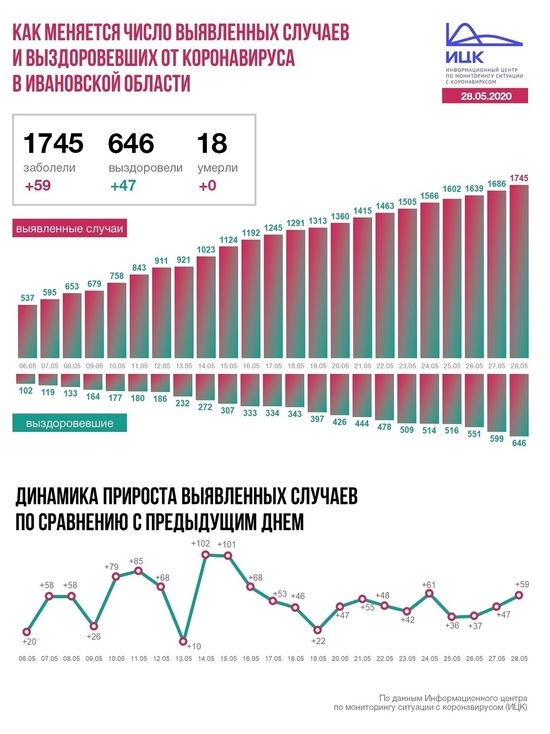 В Ивановской области +59, всего 1745. За последние сутки 47 новых выздоровевших, летальных случаев нет. Всего 646 и 18 соответственно.