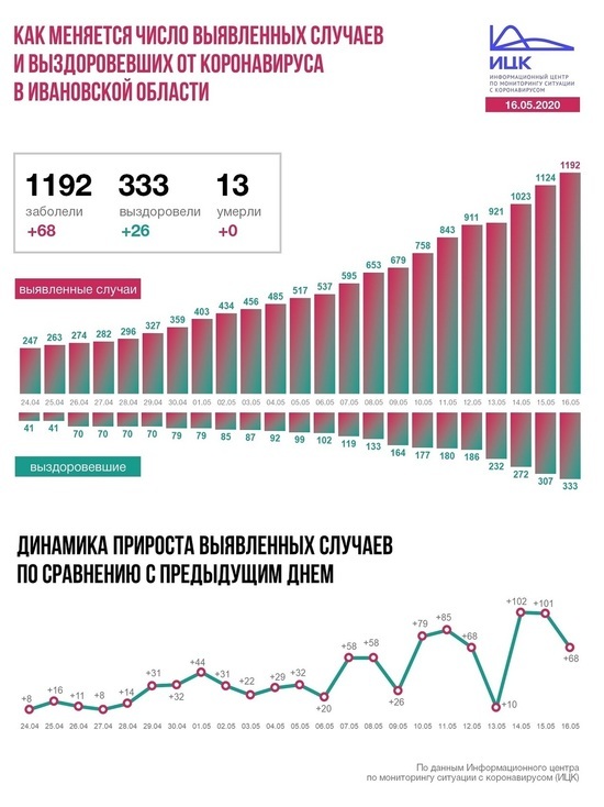В Ивановской области +68, всего 1192. За последние сутки 26 новых выздоровевших, летальных случаев нет. Всего 333 и 13 соответственно.