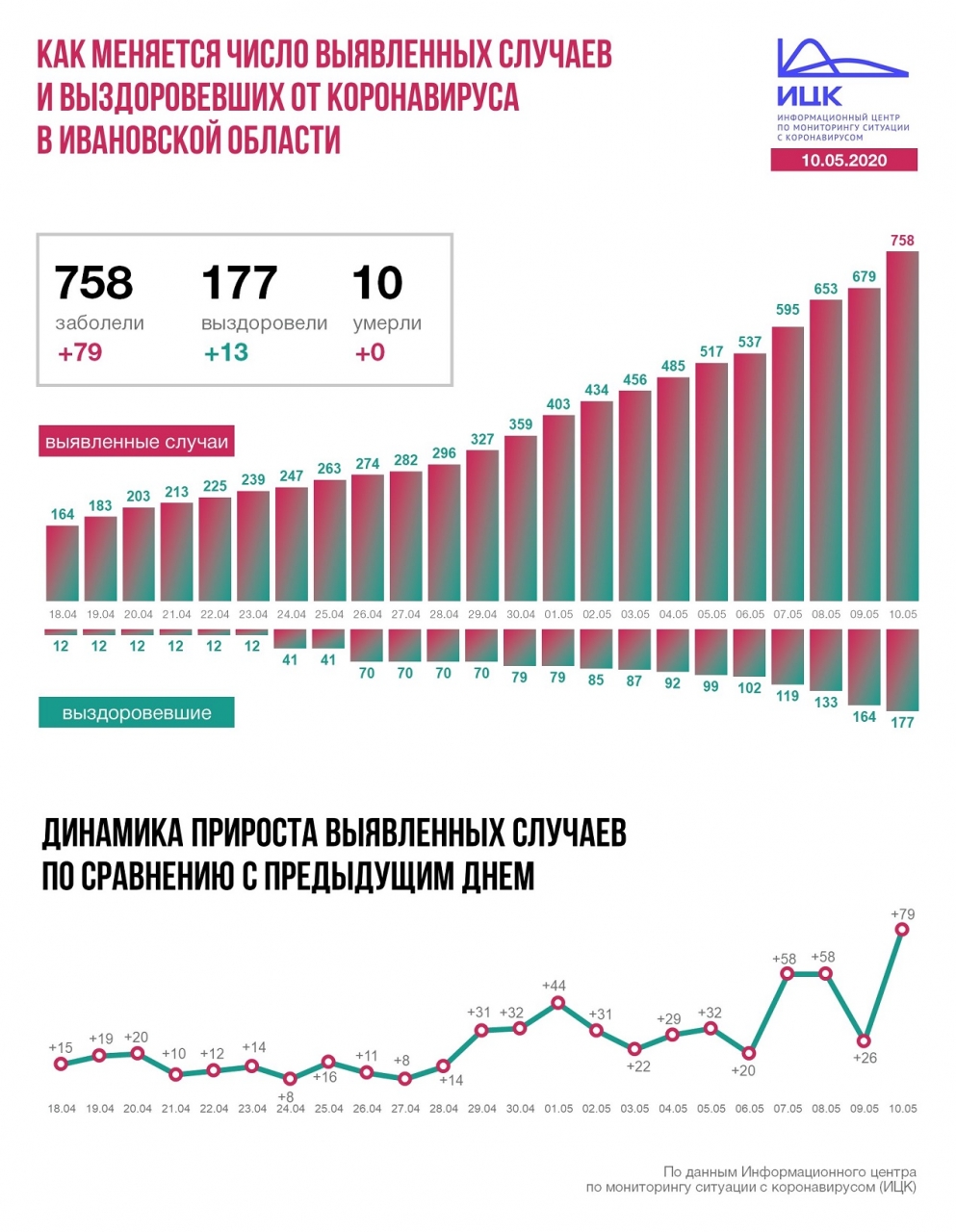 В Ивановской области +79, всего 758. За последние сутки 13 новых выздоровевших, летальных случаев нет. Всего 177 и 10 соответственно.