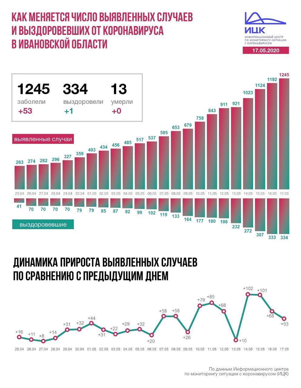 В Ивановской области +53, всего 1245. За последние сутки 1 новый выздоровевший, летальных случаев нет. Всего 334 и 13 соответственно.