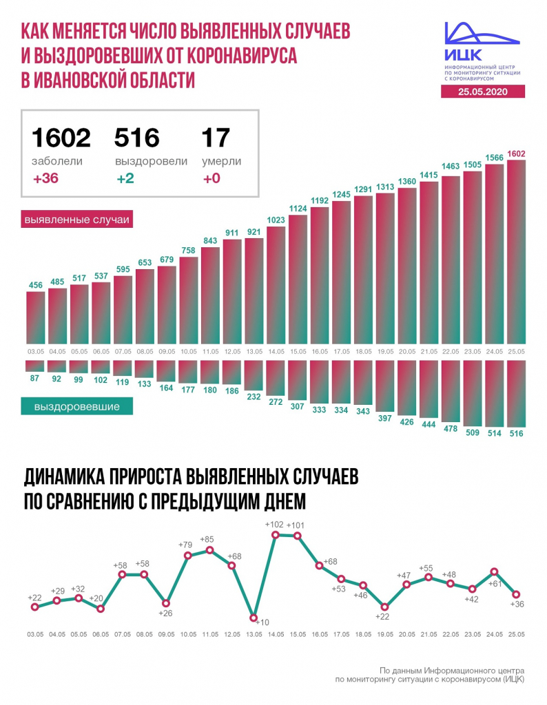 В Ивановской области +36, всего 1602. За последние сутки два новых выздоровевших, летальных случаев нет. Всего 516 и 17 соответственно.