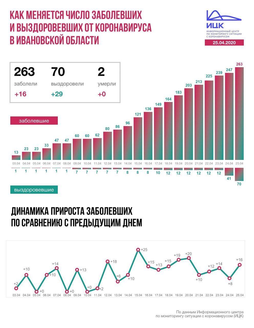 В Ивановской области +16, всего 263. За последние сутки 29 новых выздоровевших, летальных случаев нет. Всего 70 и 2 соответственно.