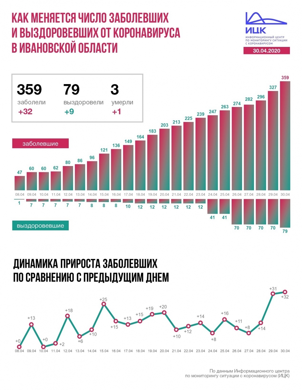 В Ивановской области +32, всего 359. За последние сутки 9 новых выздоровевших и 1 летальный случай. Всего 79 и 3 соответственно.