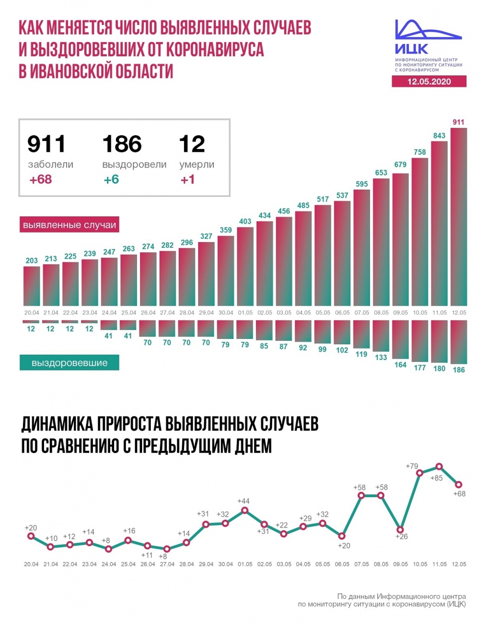В Ивановской области +68, всего 911. За последние сутки 6 новых выздоровевших, одинлетальный случай. Всего 186 и 12 соответственно.