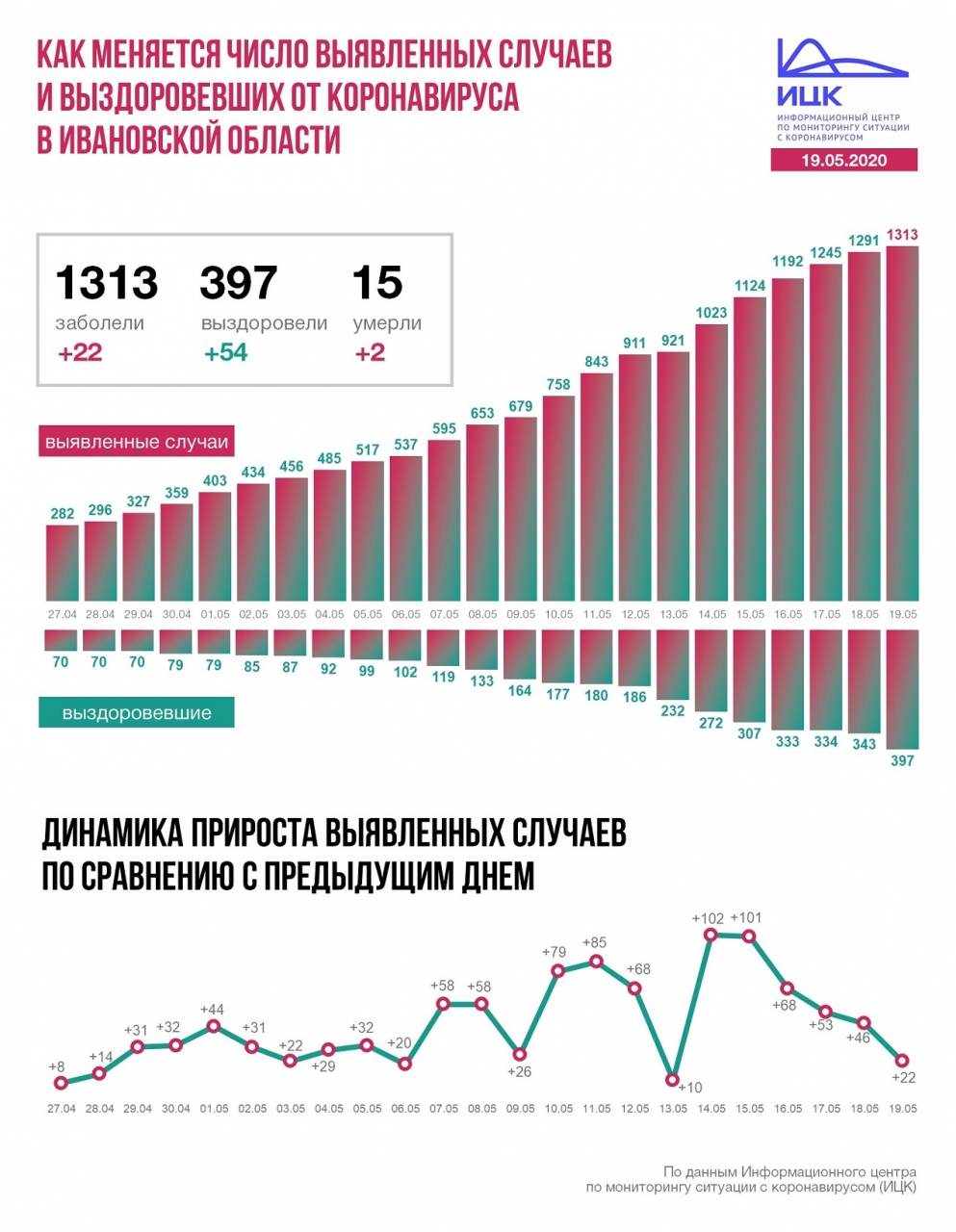 В Ивановской области +22, всего 1313. За последние сутки 54 новых выздоровевших, 2 летальных случая. Всего 397 и 15 соответственно.