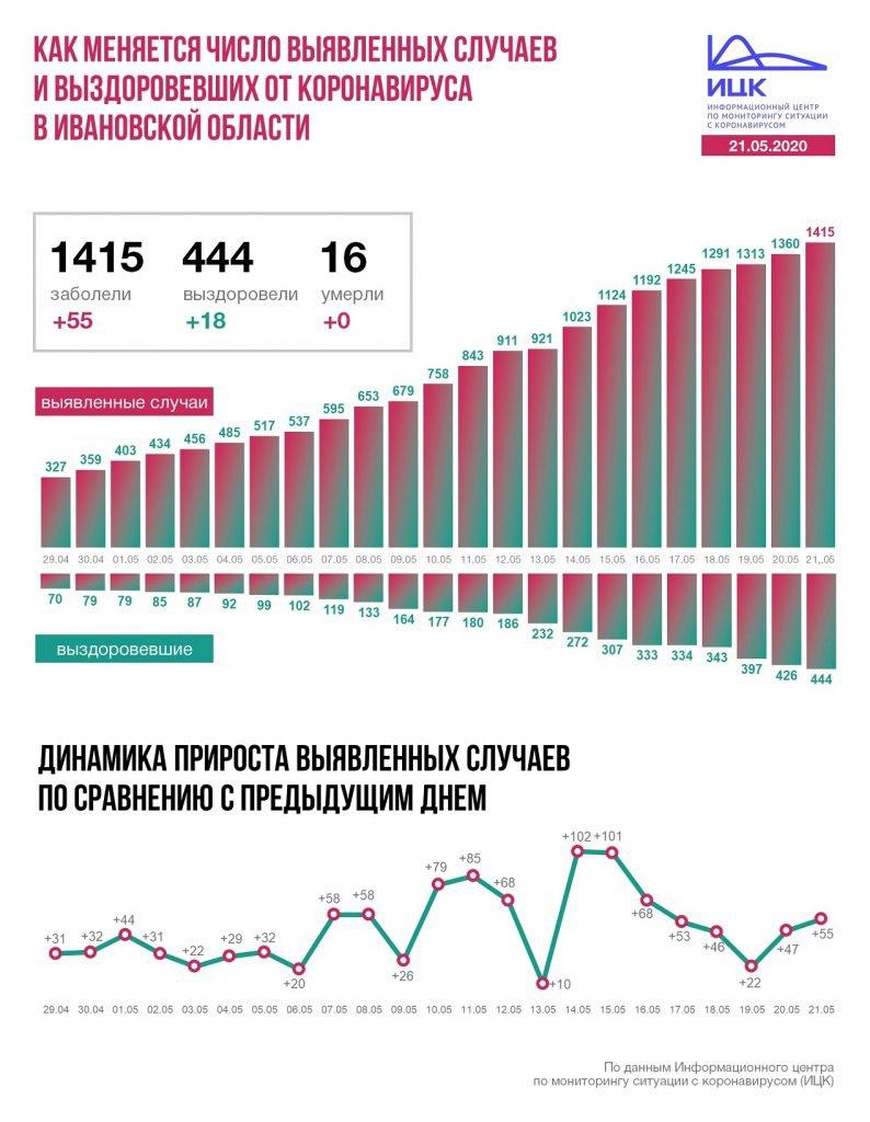 В Ивановской области +55, всего 1415. За последние сутки 18 новых выздоровевших, летальных случаев нет. Всего 444 и 16 соответственно.