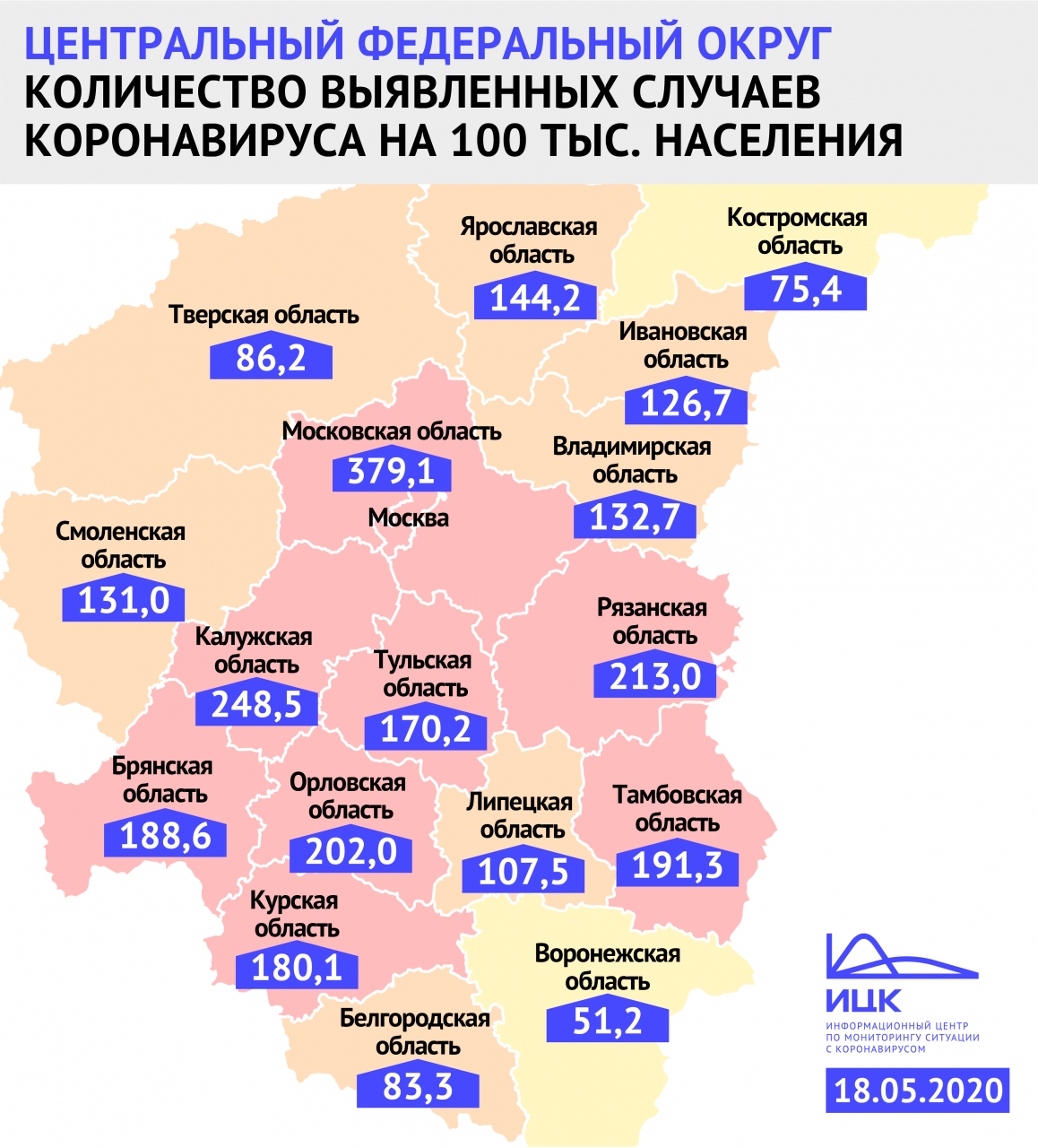 В ЦФО самый высокий показатель (за исключением Москвы и Московской области) в Калужской области — 248,5 выявленных случаев на 100 тыс., наименьший сохранился в Воронежской области 51,2 выявленных случая на 100 тыс.