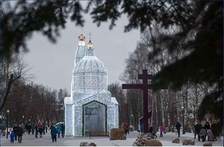 Как и в прошлом году, в память об одном из самых древних храмов в Шуе, уничтоженном в 1930 году – храме Спаса Нерукотворного установят рождественскую иллюминацию и символ фестиваля — световую инсталляцию «Храм».