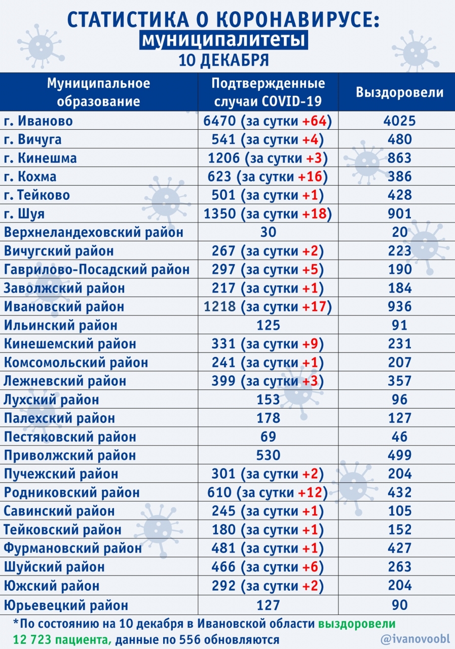 Обнародованы данные по заражению коронавирусом в муниципалитетах Ивановской области на 10 декабря Рубрика: Общество Только в Иванове за сутки подтверждено 64 случая заражения chastnik.ru