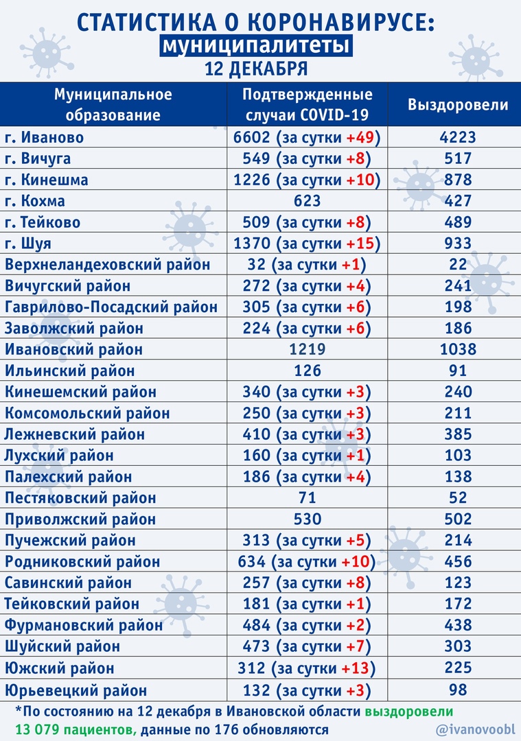 Обнародованы данные по заражению коронавирусом в муниципалитетах Ивановской области на 12 декабря Рубрика: Общество В тройке «лидеров» — Иваново, Шуя, Южский район chastnik.ru