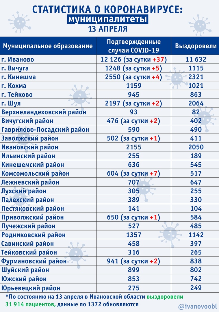 121 заболевший за сутки, трое умерли Ситуация по городским округам и районам Ивановской области
