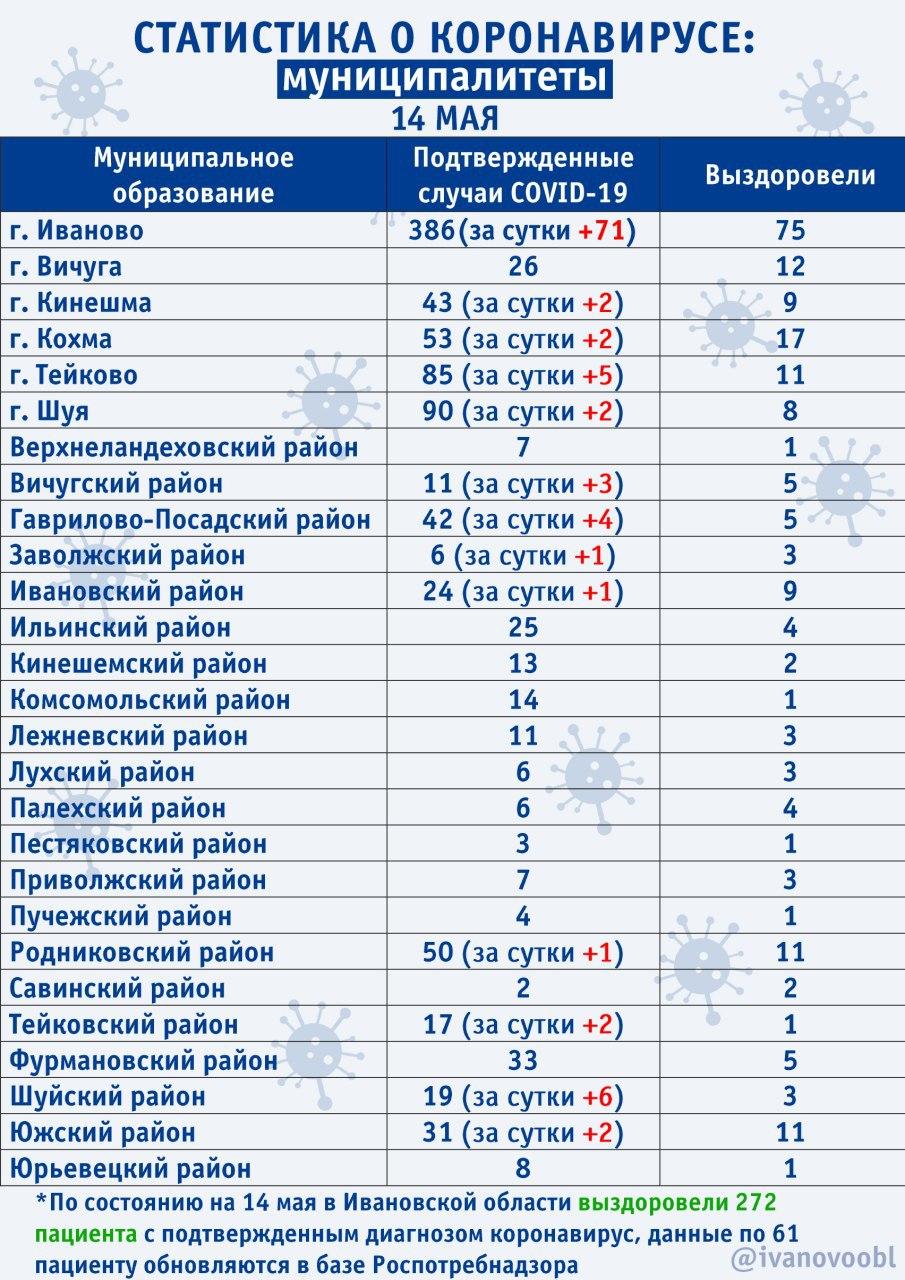 Ситуация по городским округам и районам Ивановской области 14 мая: за двое суток +112 подтвержденных случаев коронавируса.