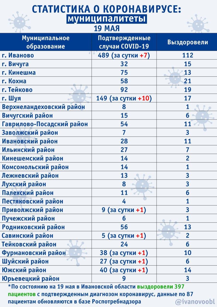 Ситуация по городским округам и районам Ивановской области 19 мая: за сутки +22 подтвержденных случаев коронавируса.