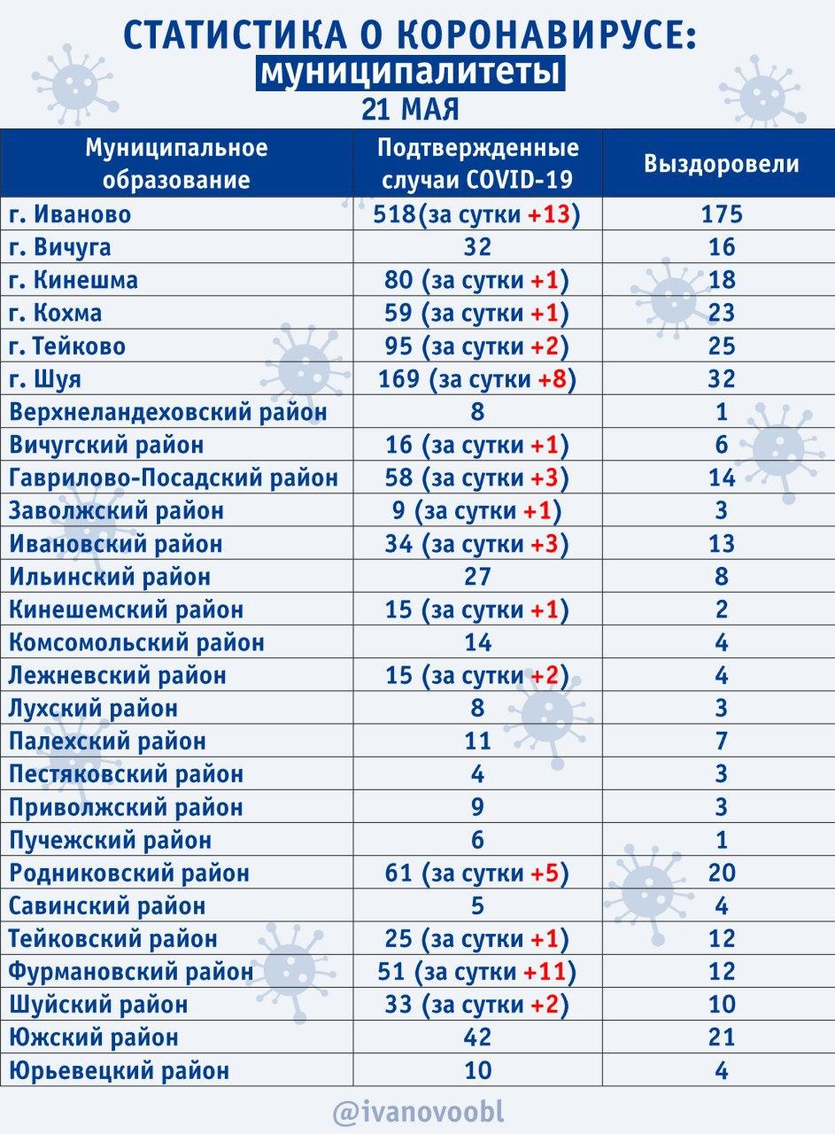 Ситуация по городским округам и районам Ивановской области 21 мая: за сутки +55 подтвержденных случаев коронавируса (всего 1415), выздоровели 444 пациента.