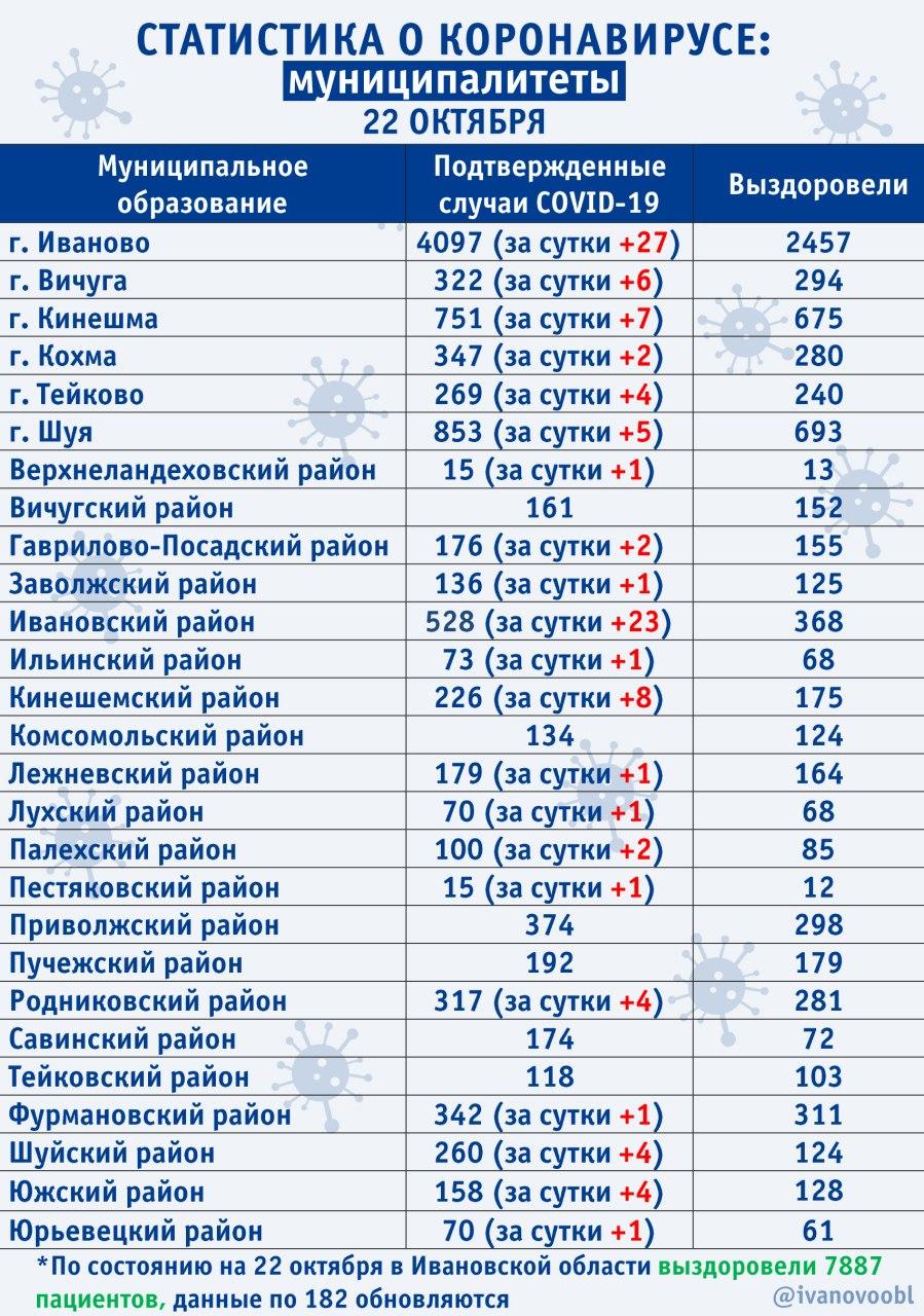 Обнародованы данные по заражению коронавирусом в муниципалитетах Ивановской области на 22 октября Рубрика: Общество Новых случаев не зафиксировано лишь в пяти районах chastnik.ru