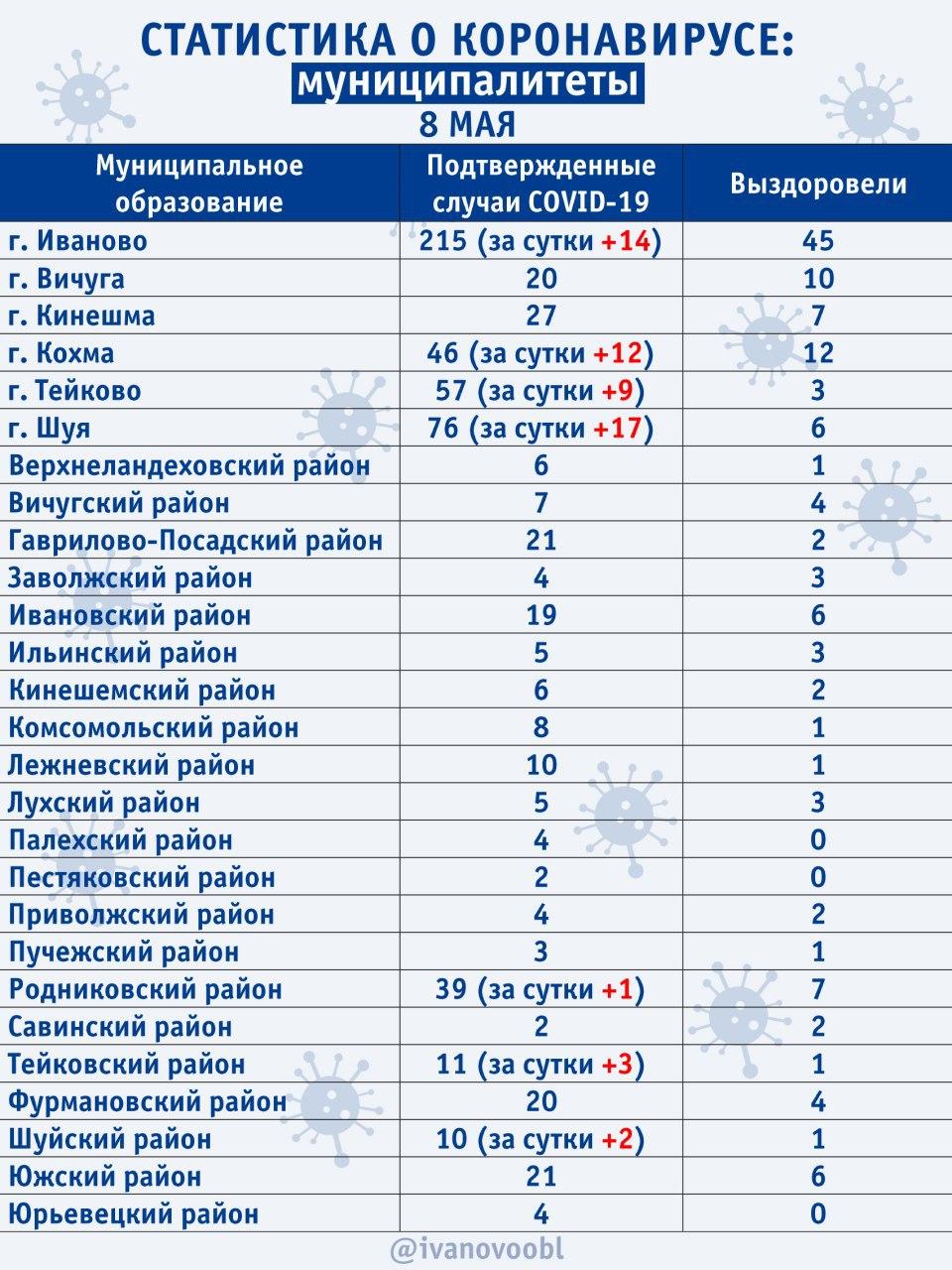 Ситуация по городским округам и районам Ивановской области 8 мая: за сутки +58 подтвержденных случаев коронавируса (города Иваново, Кохма, Тейково, Шуя, Родниковский, Тейковский и Шуйский районы).