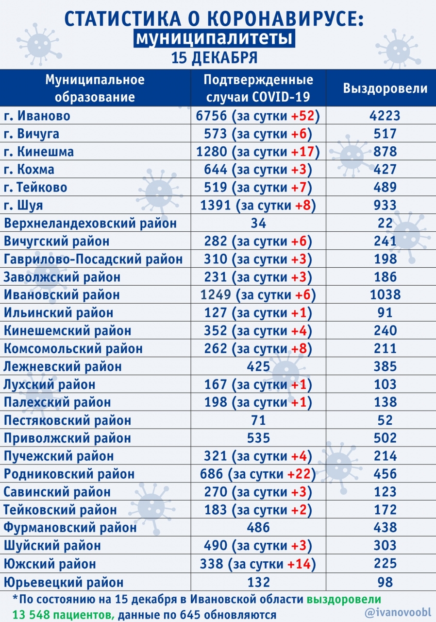 121 заболевший за сутки, трое умерли Ситуация по городским округам и районам Ивановской области