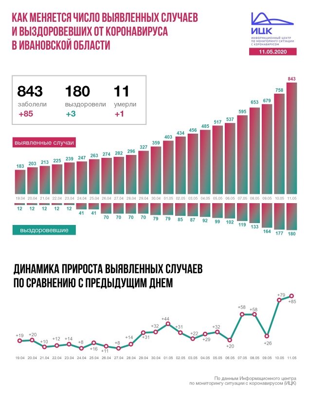 В Ивановской области +85, всего 843. За последние сутки 3 новых выздоровевших, 1 летальный случай. Всего 180 и 11 соответственно.