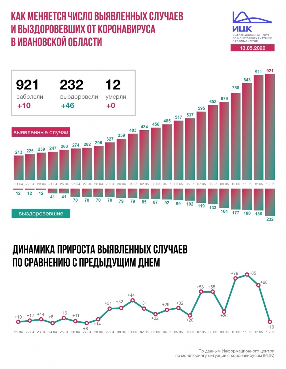 В Ивановской области +10, всего 921. За последние сутки 46 новых выздоровевших, летальных случаев нет. Всего 232 и 12 соответственно.