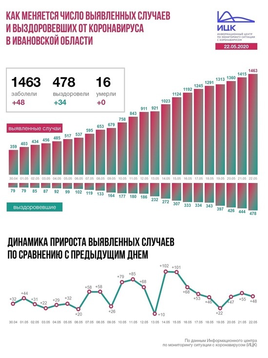 В Ивановской области +48, всего 1463. За последние сутки 34 новых выздоровевших, летальных случаев нет. Всего 478 и 16 соответственно.