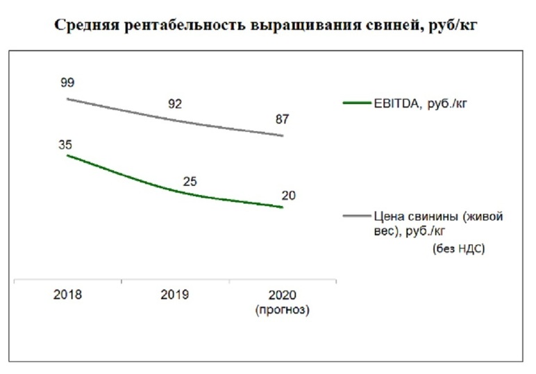 По прогнозу Банка, в 2019 году снижение цен и рост себестоимости на 5% приведут к уменьшению маржинальности производства свинины с 35 руб/кг до 25 руб/кг. В 2020 году маржинальность может сократиться еще больше – до 20 руб/кг.