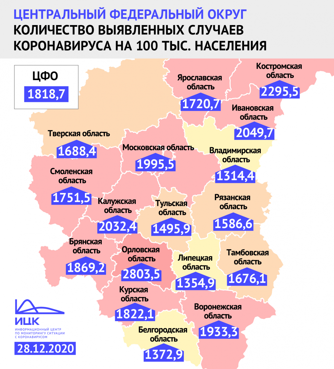 В среднем по ЦФО на каждый 100 тысяч человек приходится 1818,7 зараженных.