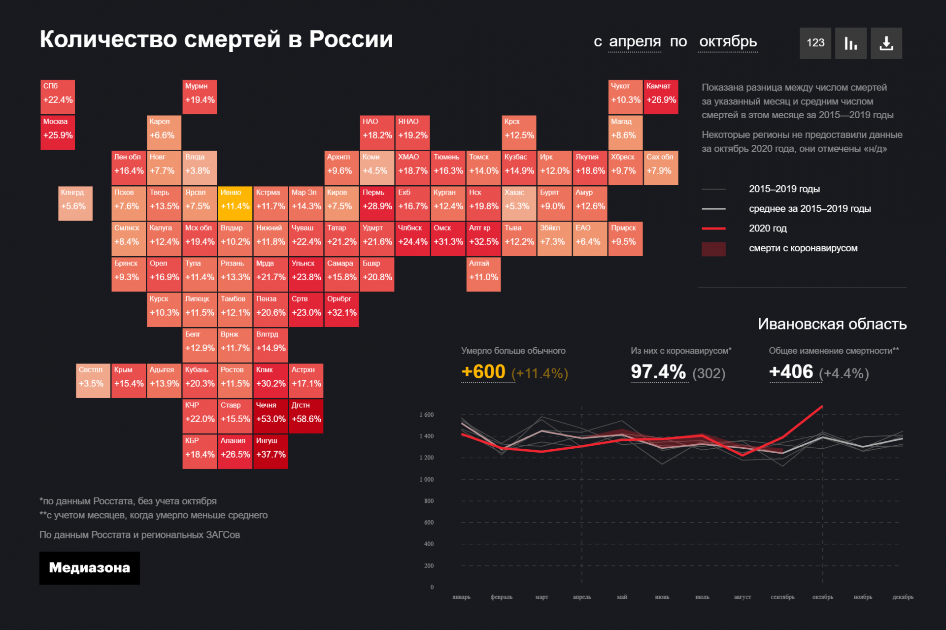 Первое число — это превышение уровня смертности по сравнению со средней. Чем краснее регион, тем выше этот показатель. Если превышения за выбранный период нет, на карте появится серый регион с нулевым значением.