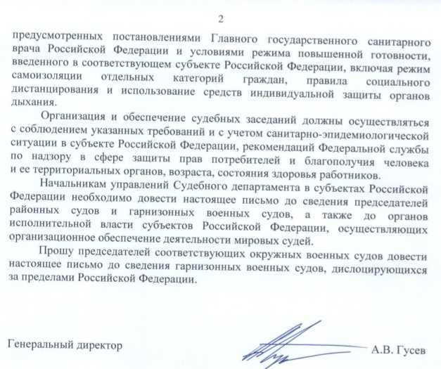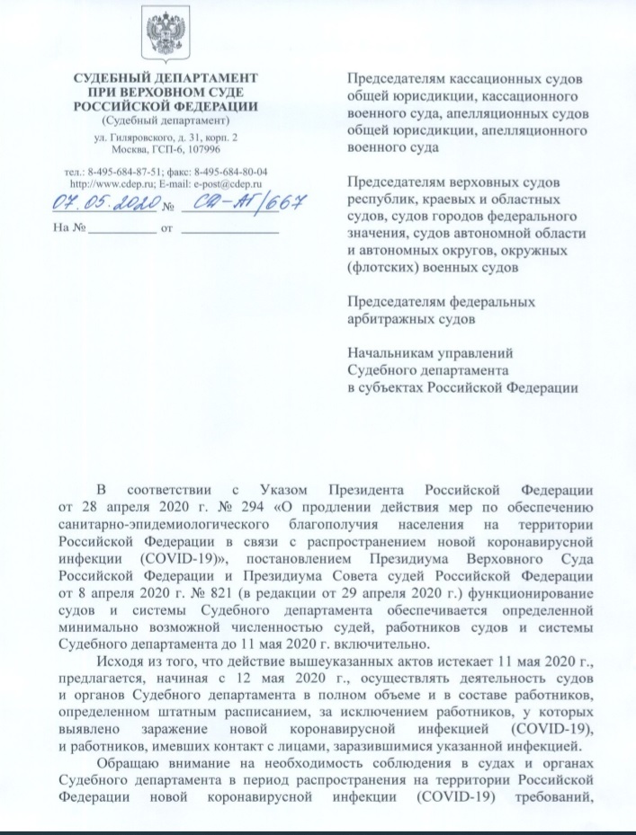 В письме, в частности, говорится: «предлагается, начиная с 12 мая 2020 года осуществлять деятельность судов и органов Судебного департамента в полном объеме и в составе работников, определенных штатным расписанием, за исключением тех, у которых выявлено заражение новой коронавирусной инфекцией, и работников, имевших контакт с лицами, заразившимися указанной инфекцией».