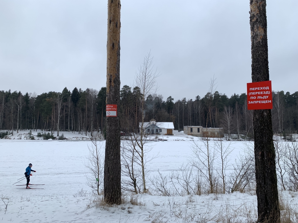 В парке около водоема установлены запрещающие таблички «Переход (проезд) по льду запрещен», но, судя по следам на снегу, жители постоянно переходят водоем по льду, катаются на коньках.