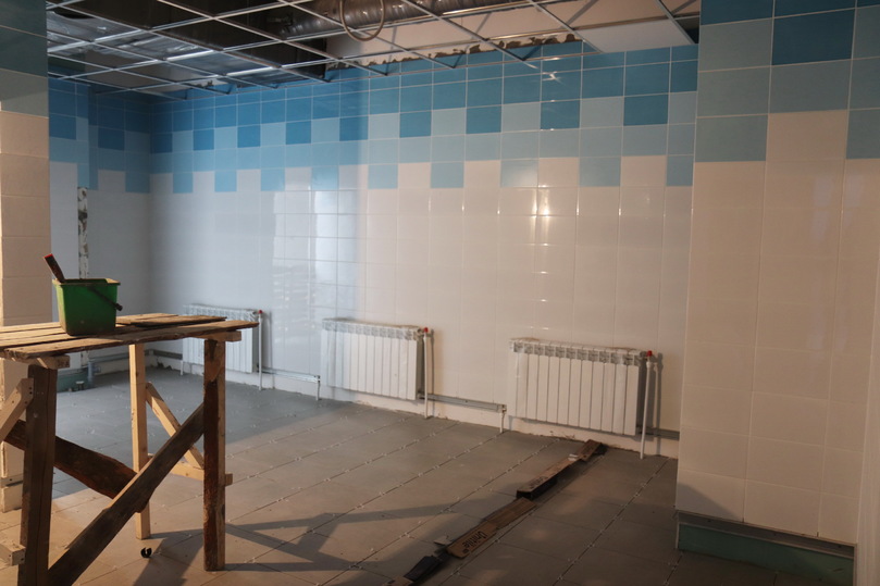 В настоящее время завершаются монтажно-строительные работы в физкультурно-оздоровительном блоке. Здесь выполнены работы по внутренней отделке помещений, заканчивается монтаж инженерных сетей, производится установка санитарно-технического оборудования. В спортивном блоке ведется монтаж автоматической пожарной системы и системы вентиляции. Ведутся отделочные работы спортивного зала и подсобных помещений.