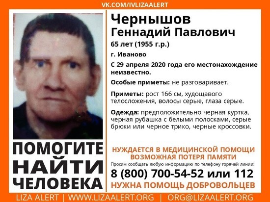 Геннадий Чернышев, 65 лет, пропал 29 апреля, с этого момента о его местонахождении нет никаких знаний.
