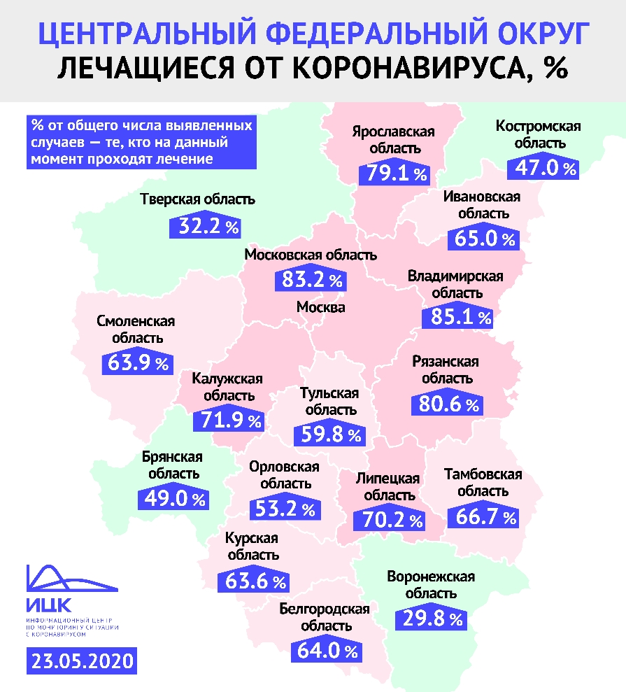 Наименьшая доля активных случаев в ЦФО приходится на Воронежскую (29,8%) и Тверскую (32,2%) области, наибольшая — во Владимирской области (85,1%). Всего в ЦФО (без учета Москвы) порядка 73,6% активных случаев.