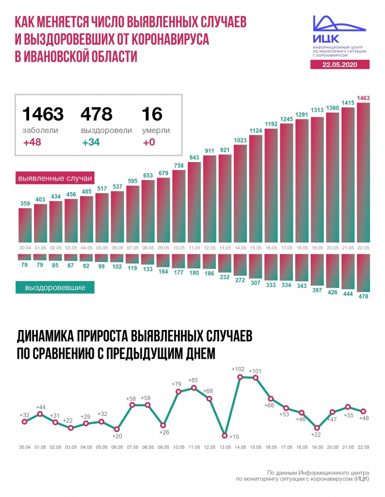 В Ивановской области +48, всего 1463. За последние сутки 34 новых выздоровевших, летальных случаев нет. Всего 478 и 16 соответственно.