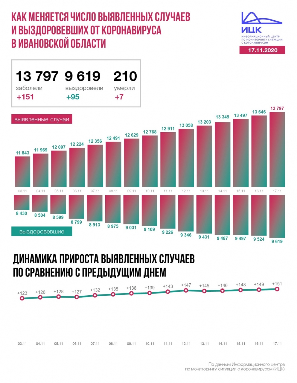 По состоянию на 17 ноября 2020 года, в Ивановской области зарегистрировано 13 797 случаев новой коронавирусной инфекции. За сутки подтвержден 151 диагноз. Скончалось семь человек