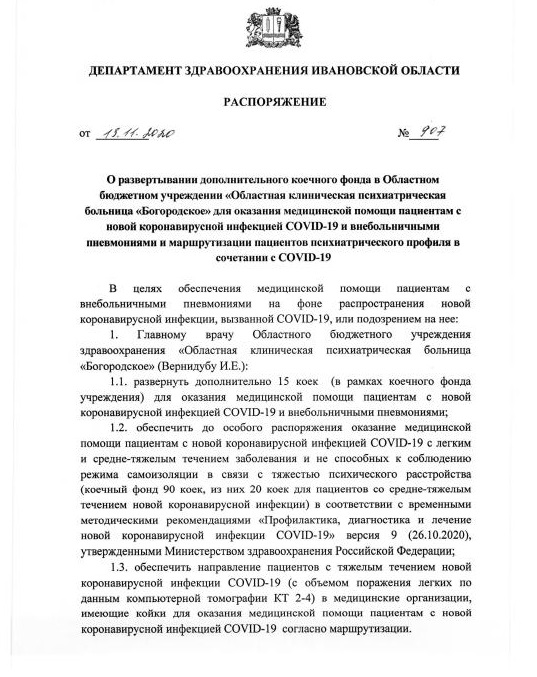 В областной клинической психиатрической больнице «Богородское» дополнительно развернут 15 коек для оказания помощи пациентам с новой коронавирусной инфекцией.