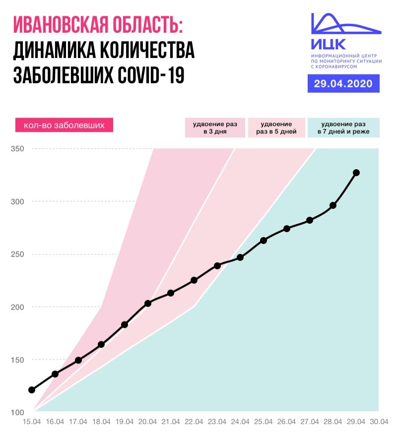 Проектный офис Информационного центра по коронавирусу в России сделал расчет динамики распространения коронавируса В Ивановской области. На данный момент удвоение числа зараженных коронавирусом происходит раз в семь дней, ранее оно происходило раз в три дня (чем за меньшее число дней удваивается число зараженных, тем быстрее распространяется вирус, — пояснили аналитики ИЦК).