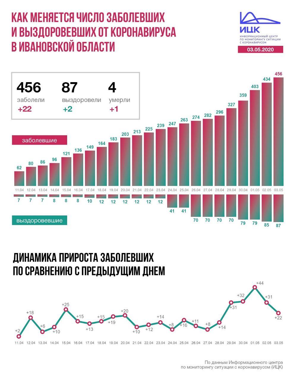 В Ивановской области +22, всего 456. За последние сутки вое новых выздоровевших и один летальный случай. Всего 87 и четыре соответственно.