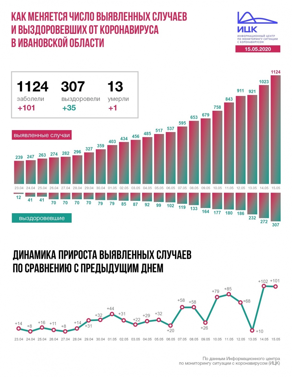 В Ивановской области +101, всего 1124. За последние сутки 35 новых выздоровевших, один летальный случай. Всего 307 и 13 соответственно.