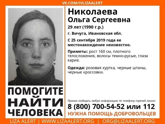 О местонахождении Ольги Николаевой, 29-летней жительницы Вичуги, ничего не известно с 25 сентября. Тем не менее, поисковики из отряда «Лиза Алерт» не теряют надежды и просят отозваться всех, кто обладает какой-либо информацией о судьбе девушки.