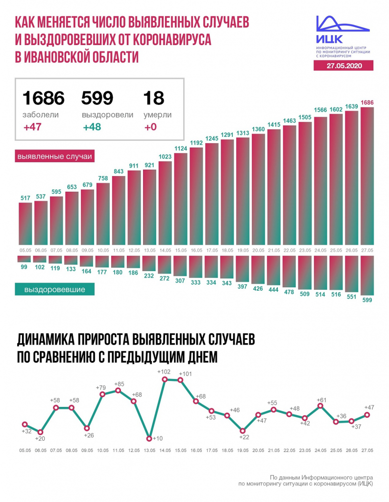 В Ивановской области +47, всего 1686. За последние сутки 48 новых выздоровевших, летальных случаев нет. Всего 599 и 18 соответственно.